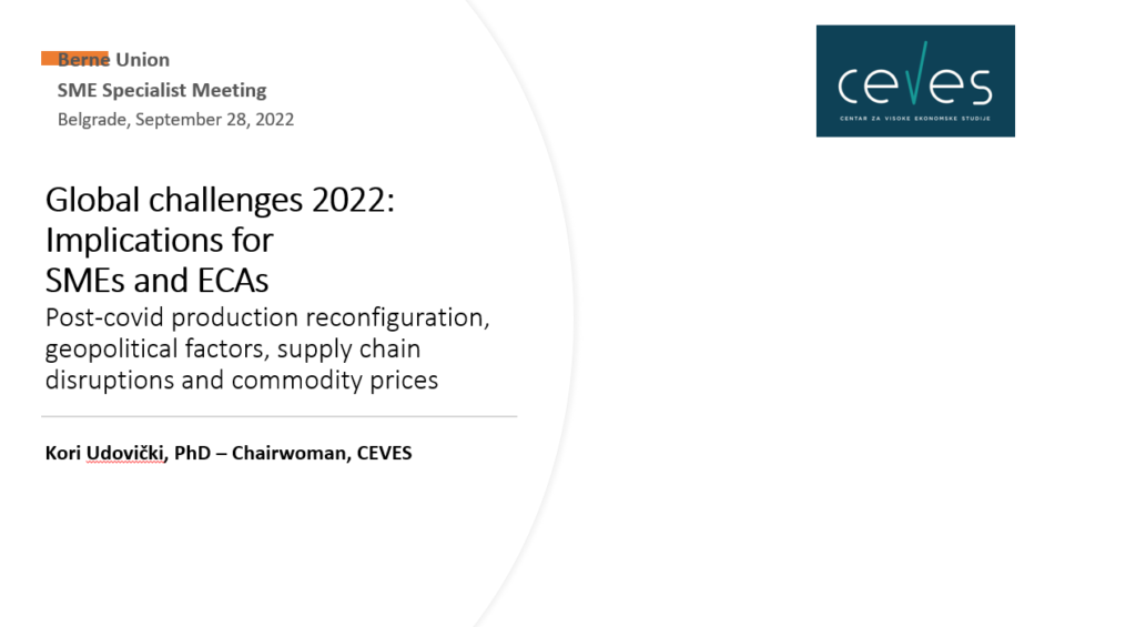 Vesti Globalni izazovi za MSP 2022 – Prezentacija Kori Udovički Kori Udovički, predsednica i glavni ekonomista CEVES-a, predstavila je analizu ključnih globalnih izazova i njihovih implikacija na MSP u Srbiji Programska oblast: Vesti, Razvoj privatnog sektora i industrijska politika Pročitaj više » 28.11.2022