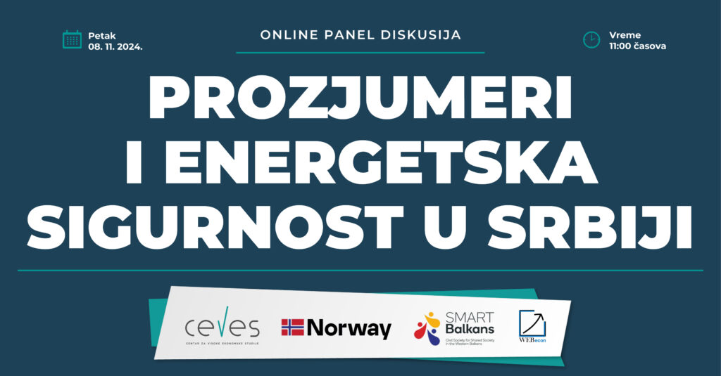Na online panel diskusiji „Prozjumeri i energetska sigurnost u Srbiji“ (petak, 8. novembar; 11:00h; platforma Teams) tražimo odgovore na važna pitanja poput: Koja je uloga prozjumera u energetskoj sigurnosti i zelenoj tranziciji? Kava je situacija u Srbiji u poređenju sa EU i zemljama Zapadnog Balkana? Koji su najčešći izazovi za domaćinstva, kakve su procedure i da li je u Srbiji ekonomski isplativno biti prozjumer?